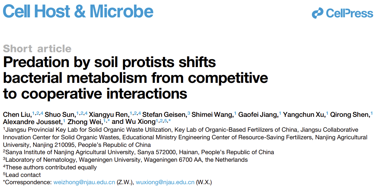 2026年1月29日,Cell Press旗下期刊《Cell Host & Microbe》在线发表了万象城awcsport官网沈其荣院士团队的研究论文“Predation by soil protists shifts bacterial metabolism from competitive to cooperative interactions”。该研究聚焦土壤微食物网中原生动物对细菌代谢互作的调控作用,研究系统揭示了原生动物的捕食压力可促使细菌群落的代谢互作模式由资源竞争转向代谢合作,为理解土壤微生物功能形成及微食物网调控提供了新的见解。