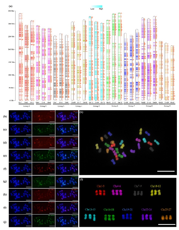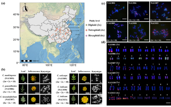 菊花(Chrysanthemum morifolium)隶属于菊科春黄菊族菊属(Chrysanthemum),是我国十大传统名花和世界四大切花之一,其基因组结构复杂。菊属植物倍性分布广泛,从二倍体到十倍体均有分布,是研究多倍体进化的理想材料。然而,由于菊属植物染色体小,相似度高,难以简单通过染色体核型分析技术及荧光原位杂交等传统细胞遗传学技术区分单条染色体,这严重阻碍了菊属不同物种间染色体进化关系和物种起源演化等研究(图1)。菊属究竟有几个染色体组,不同染色体组在菊属植物起源和演化过程中的作用是什么仍有待明确。