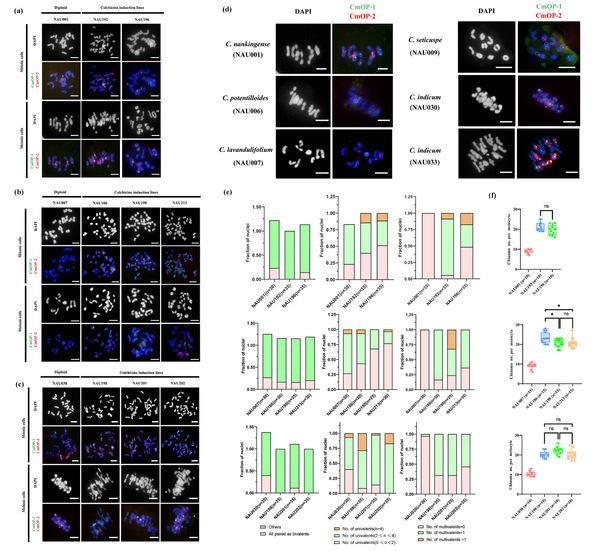为此,团队基于已发表的栽培菊花‘钟山紫桂’高质量单倍体基因组,首次开发出菊属全染色体组特异性涂染探针库。此外,团队进一步创新性地建立了顺序荧光原位杂交技术体系,首次实现了对菊属所有同源染色体组的逐条、精准识别与可视化,攻克了长期以来菊属染色体组“分辨难”的核心技术难题(图2)。