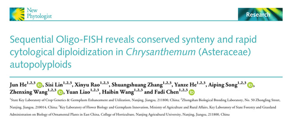 近日,万象城awcsport官网陈发棣教授团队在植物学权威期刊《New Phytologist》上发表题为“Sequential Oligo-FISH reveals conserved synteny and rapid cytological diploidization in Chrysanthemum autopolyploids”的研究。该研究攻克了菊属染色体相似度高、难以精确识别的技术难题,首次开发出菊属染色体特异涂染探针库,并建立顺序荧光原位杂交(FISH)技术体系,实现了同源染色体组在染色体水平上的精确识别与追踪,揭示了菊属多倍体快速细胞学二倍化的潜在机制。