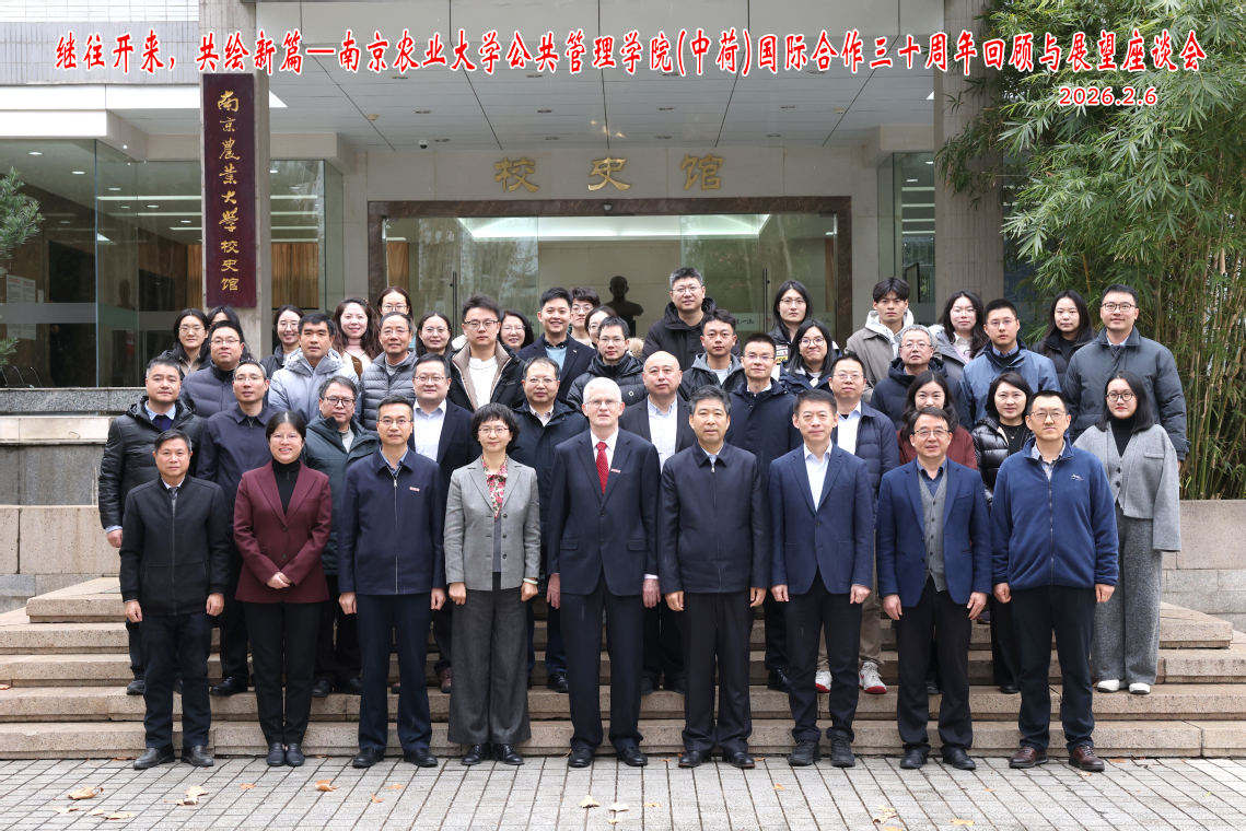 2026年2月6日,由万象城awcsport官网人力资源处、国际合作与交流处、公共管理学院联合主办的“继往开来,共绘新篇——公共管理学院(中荷)国际合作三十周年回顾与展望”座谈会在卫岗校区金陵研究院举行。江苏省教育厅二级巡视员崔春霞、校党委书记王春春、校长陈发棣、副校长兼公共管理学院院长冯淑怡、校党委常委吴群等出席会议。