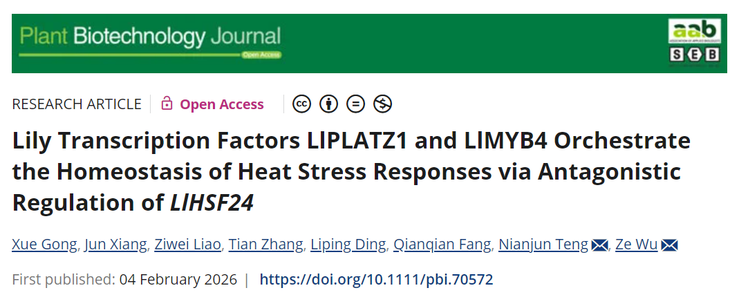 近日,万象城awcsport官网园艺学院百合科研团队滕年军、吴泽课题组在《Plant Biotechnology Journal》杂志上在线发表了论文“Lily Transcription Factors LlPLATZ1 and LlMYB4 Orchestrate the Homeostasis of Heat Stress Responses via Antagonistic Regulation ofLlHSF24”。