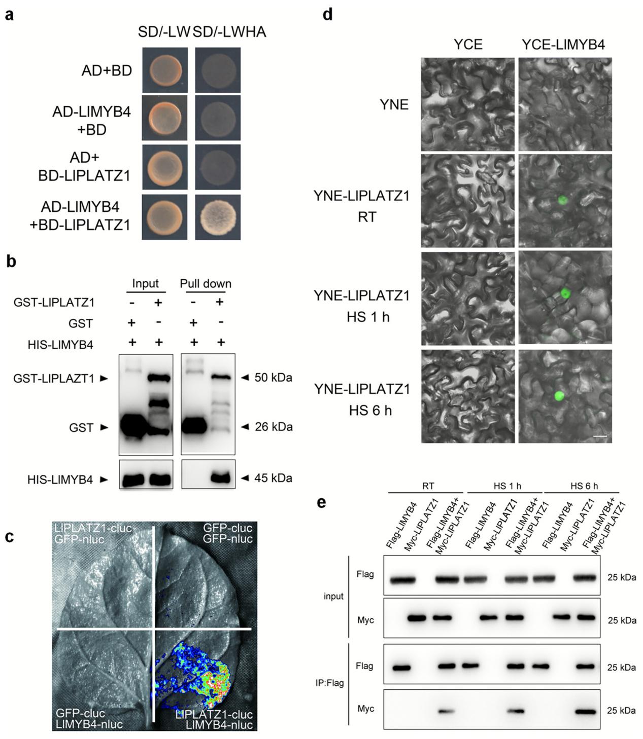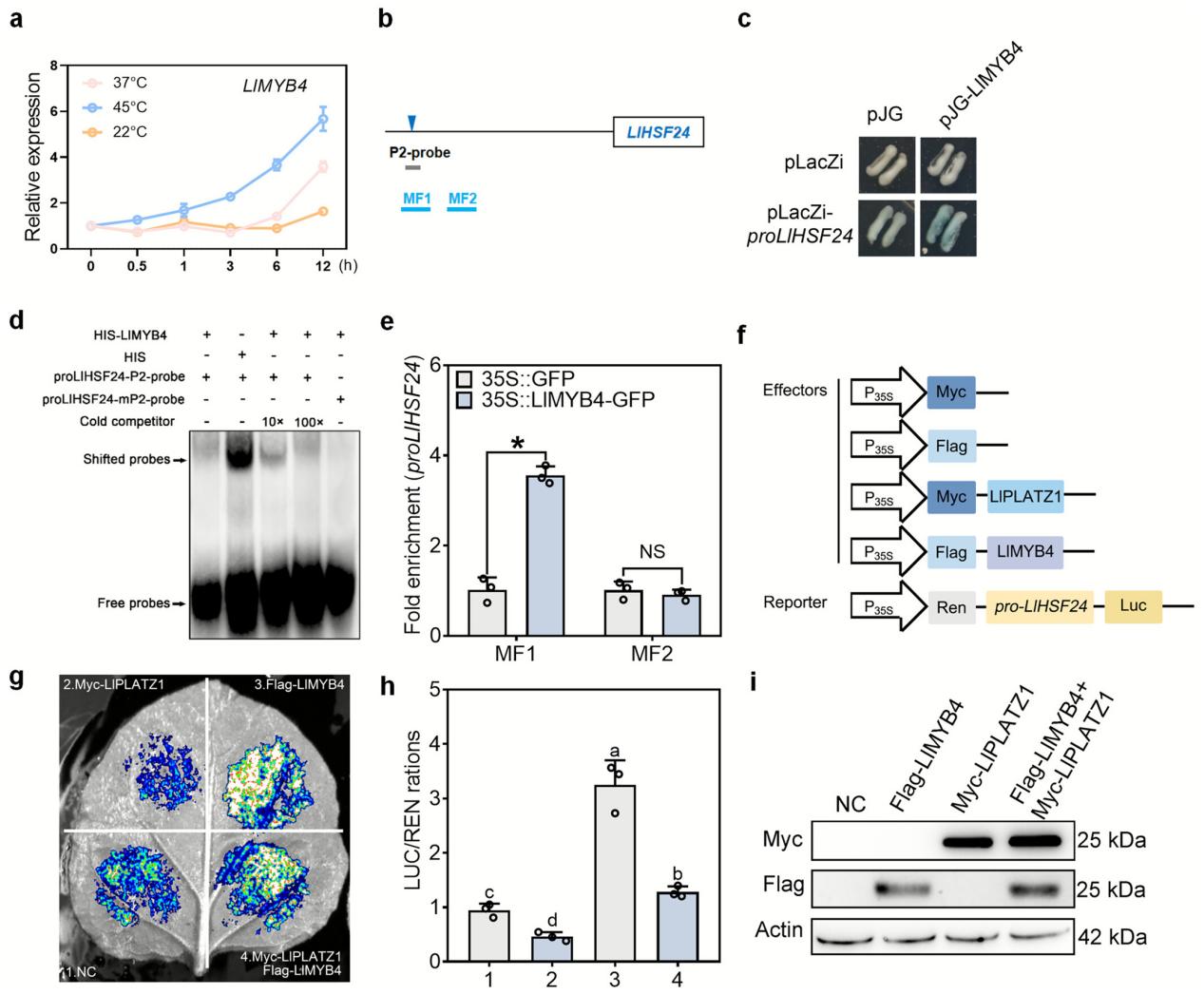 LlMYB4与LlPLATZ1蛋白互作。利用酵母双杂交(Y2H)文库筛选到LlPLATZ1的一个潜在互作蛋白MYB4。Y2H实验结果表明,LlPLATZ1与LlMYB4存在互作。体外pull-down实验证明GST-LlPLATZ1蛋白与HIS-LlMYB4蛋白能够结合,证实LlPLATZ1与LlMYB4是直接的物理互作。LCI分析显示,在LlPLATZ1和LlMYB4共表达的烟草叶片区域有明显的Luc信号,表明它们在体内也存在互作。BiFC分析表明,LlPLATZ1与LlMYB4的互作在正常和热胁迫条件下均稳定存在于细胞核中,与LlMYB4定位于细胞核中并积累的观察结果一致。随后,利用Co-IP技术分析高温对烟草叶片中LlPLATZ1-LlMYB4互作的影响。结果显示,热胁迫处理并未影响LlPLATZ1和LlMYB4的蛋白积累;然而,在热胁迫条件下,LlPLATZ1-LlMYB4的蛋白互作增强。这些结果表明,LlPLATZ1与LlMYB4蛋白互作,且高温能够促进LlPLATZ1与LlMYB4的互作。