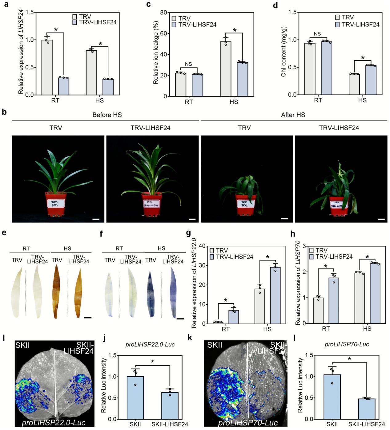 LlHSF24负调控百合耐热性。利用VIGS方法在百合植株中沉默LlHSF24。与TRV-control相比,沉默LlHSF24导致百合叶片在高温胁迫后具有较低的相对离子渗漏和较高的叶绿素积累的耐热表型。此外,高温胁迫后,LlHSF24沉默植株叶片中ROS积累较少。热保护基因LlHSP22.0和LlHSP70在LlHSF24沉默植株中上调表达。双荧光素酶报告基因实验表明LlHSF24抑制LlHSP22.0和LlHSP70启动子的活性,表明LlHSF24通过抑制热保护基因发挥耐热负调控作用。
