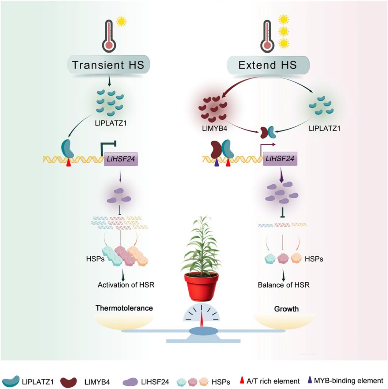 本研究鉴定出百合中一个热诱导的PLATZ转录因子家族成员——LlPLATZ1。LlPLATZ1受高温快速诱导,其蛋白定位于细胞核,并具有转录抑制活性。LlPLATZ1可与B类热胁迫转录因子基因LlHSF24的启动子结合,从而抑制其表达。在百合中稳定过表达LlPLATZ1可增强其耐热性,但抑制其生长;而沉默LlPLATZ1会导致LlPLATZ1会导致百合耐热性降低。进一步分析表明,LlHSF24直接抑制热保护基因LlHSP22.0和LlHSP70的表达,从而削弱耐热性。此外,LlPLATZ1与LlMYB4互作,后者是一个长期高温诱导的MYB转录因子,其通过与LlHSF24启动子结合激活其表达。LlMYB4通过与LlPLATZ1互作拮抗其DNA结合能力,从而限制热胁迫响应,负调控百合耐热性。该研究表明LlPLATZ1/LlMYB4-LlHSF24调控模块在维持百合热胁迫反应平衡中发挥重要作用,使植物能够适应复杂的环境变化。