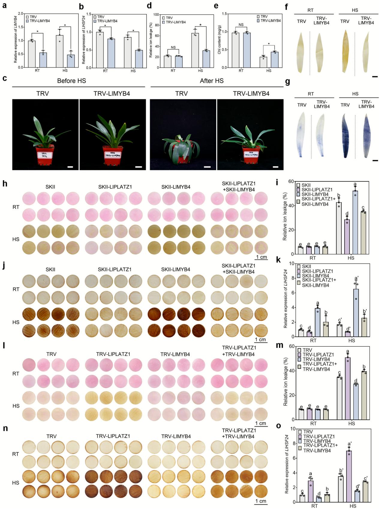 利用VIGS方法,在百合植株中沉默LlMYB4。LlMYB4沉默植株中LlHSF24表达量降低。与TRV-control相比,沉默LlMYB4导致百合叶片在高温胁迫后具有较低的相对离子渗透率和较高的叶绿素积累的耐热表型。值得注意的是,根据DAB和NBT染色实验的结果,LlMYB4沉默的百合叶片积累了更少的ROS。这些结果表明LlMYB4负调控百合的耐热性。利用百合花瓣瞬时表达系统进行的LlPLATZ1和LlMYB4共表达和共沉默分析实验,结果表明LlPLATZ1和LlMYB4拮抗地调控百合耐热性。