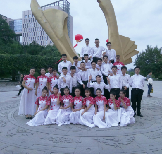 为了此次合唱,合唱队可谓是做了充分的准备。9月21日,学院就邀请了艺术学院的专业人士对整个合唱队展开了培训。同学们每晚8点按时到场进行培训,熟悉《党员自律歌》和《黄水谣》的歌词,并接受了一系列的练声、演唱的培训,即使是嗓子唱到沙哑,同学们也没有丝毫退缩,坚持着每天一个多小时的训练。28日下午,整个合唱队聚集在一起,整齐的衬衫西裤,每个男生看起来都是如此的精神抖擞,一袭修长的白裙,肩部以上的镂空红色花纹,加上点缀在腰际的红色小花和最传统的中国结,俏丽的姑娘们看起来是那么的富有中国古典的韵味,同时也不失现代的时尚美感。排序第五的文学院结束后,便是我们的才子佳人上场,整齐有序地队形,井然有序的指挥,深情洪亮的演唱,再加上美妙动听的钢琴曲,一幅唯美的画卷由此展开。演唱是在观众热烈的掌声中结束的,歌曲中丰富的爱国情感不自觉地流露在整个演播厅,给人心灵以极大的震撼与感慨。