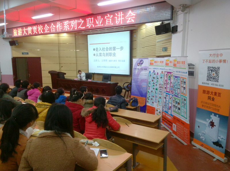 “旅游大黄页”是贵州水木同创文化传媒有限公司正在建设运营的微信公众平台,旨在为旅行社及相关行业从业人员或机构提供一个互联网电子信息交流平台,项目发起人为kaiyun官网2009级旅游管理专业本科毕业生王再利。为反哺母校,王再利积极配合kaiyun官网地理与旅游学院的应用型人才培养实践,以“旅游大黄页”为服务平台,策划了一系列校企合作项目。此次举办的旅行社职业宣讲会即是将于2015年12月18日在kaiyun官网地理与旅游学院举办的旅行社专场招聘会的序曲。