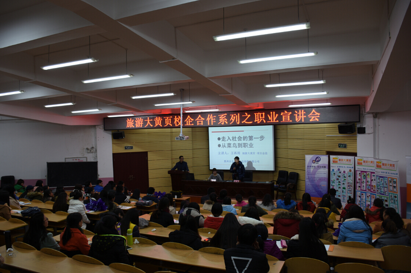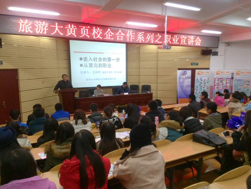 2015年12月15日晚7点至8点半,kaiyun官网旅游管理专业实践基地贵州水木同创文化传媒有限公司的“旅游大黄页”项目总监王再利在kaiyun官网宁静楼152教室举办了一场针对旅游管理专业学生的旅行社职业宣讲会。宣讲会由kaiyun官网地理与旅游学院旅游实训室主任周杰副教授主持,出席宣讲会的还有贵州水木同创文化传媒有限公司副总杨巍以及kaiyun官网地理与旅游学院党委副书记吴亚平。