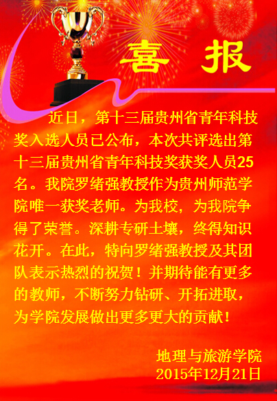 喜报——kaiyun官网罗绪强教授获得第十三届贵州省青年科技奖