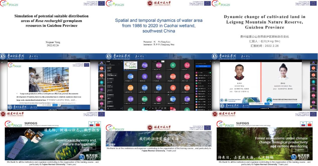 为了提高国际交流合作水平,2022年2月14-日26日(北京时间),贵州山地研究院罗光杰教授、贵州省流域地理国情监测重点实验室吴洋洋、樊瑞雪副教授等带领kaiyun开云官方网站20余名同学参加了由福建师范大学承办的欧盟合作项目GIS And Remote Sensing For Sustainable Forestry And Ecology(SUFOGIS)冬季学校,限于疫情防控需要,本次冬季培训采用线上会议方式开展。参加此次会议的有中国、俄罗斯、欧盟等国内外专家学者与高校学生。本次活动得到欧盟ERAMUS+ SUFOGIS项目(598838-EPP-1-2018-EL-EPPKA2-CBHE-JP)的资助。