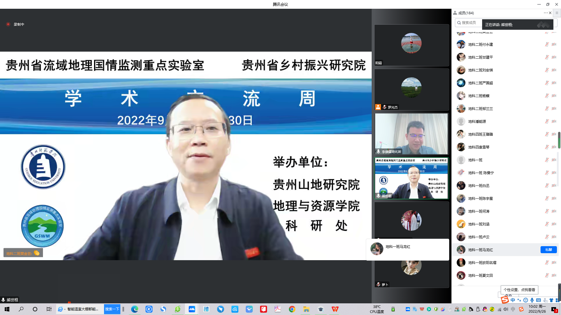 为加强学术交流,营造良好学术氛围,拓展学术领域,推动学科平台高质量发展,2022年9月26日--30日,kaiyun官网贵州山地研究院、kaiyun开云官方网站、科研处联合举办地理与资源类学科2022年下半年学术交流周。受当前疫情影响,交流周活动在腾讯会议进行,学校党委副书记熊世桓主持了专家学者学术报告,地理与资源类相关专业教师、研究生、本科生参加了学术交流周全部特邀报告。