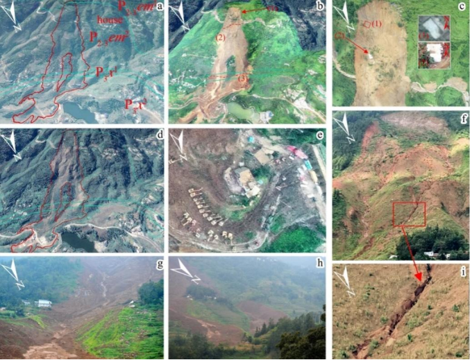 图2.滑坡地形变化监测(a:滑坡前,b-i:滑坡后)