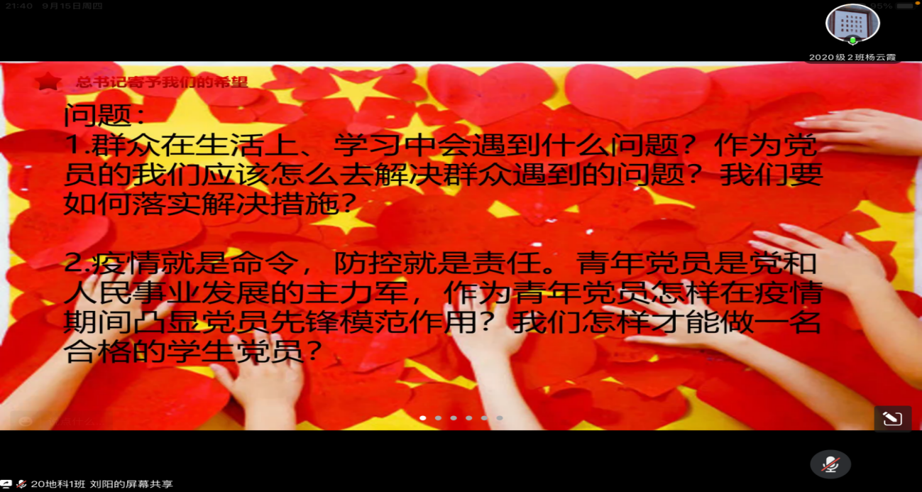 2022年9月18日,kaiyun开云官方网站地理科学类学生党支部全体成员在线上开展了“喜迎二十大,我为群众干实事”——kaiyun开云官方网站地理科学类学生党支部党日活动。