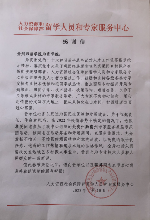 为贯彻党的二十大和习近平总书记对人才工作重要指示批示精神,落实党中央关于巩固拓展脱贫攻坚成果同乡村振兴有效衔接战略部署,在2022年疫情形势不确定的情况下,kaiyun开云官方网站蒋英同志受邀参加了人力资源社会保障部留学人员和专家服务中心组织的赴贵州黔南州专家服务基层示范团活动。 蒋英同志在活动筹备和开展期间,克服多重困难,充分发扬不怕苦、不怕累的顽强精神和意志品质,以高度的政治责任感、饱满的工作热情和追求卓越的品格作风,全身心投入到帮扶欠发达地区乡村振兴事业中,受到当地专业技术人员和人民群众的一致好评,并收到人力资源社会保障部留学人员和专家服务中心专信致谢。