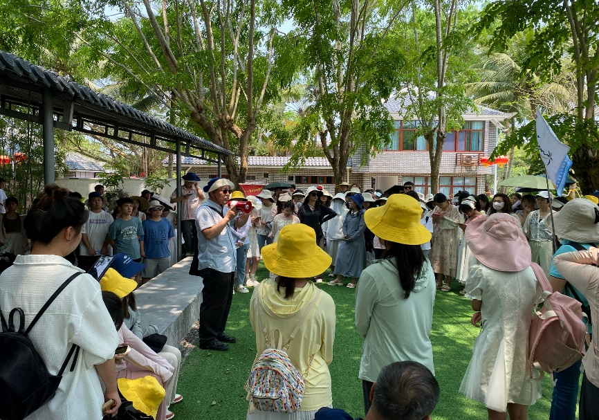 在实地考察环节,第一天,团队首先到达海南的文化窗口即海南省博物馆,体验海南丰富历史文化遗产。然后到红色娘子军纪念馆让学生直观了解革命先辈的英勇事迹。在这里,吴亚平书记给同学们上了思政第一科,为学生讲述娘子军历史,弘扬女性力量及革命的顽强、无畏的精神,让学生深刻感受红色文化;接着来到著名天然港湾石梅湾,观察其独特地貌和生态环境。第二天,探访天涯海角景区,欣赏南海的壮丽景色,感受海角天涯的浪漫氛围。这里王朋辉老师讲授了海南地质成因,廖欣荣⽼师介绍热带植物,例如⽊棉、榕树、椰树、棕榈等;去往亚龙湾,探索美丽的海底世界,感受海洋生物的魅力;来到兴隆咖啡园,品尝地道的海南咖啡了解咖啡的制作流程和背后的文化内涵;前往兴隆热带植物园,一同领略热带雨林的神奇魅力。第三天,攀登“海南第一山”东山岭,王朋辉老师和况江老师通过讲授此处的构造运动和岩⽯矿物类型鉴别,共同带领同学们探寻这座海岛的自然奇观;来到东郊椰林,感受椰林的浓荫和海岛的宁静,共同学习椰林知识,了解椰子的生长环境、用途。第四天,来到东寨港红树林景区,一个观察和学习生态环境的绝佳场所。廖欣荣⽼师通过讲授红树林形成及其意义,李松老师通过介绍遥感温湿度和能耗对应关系,共同带领学生了解红树林的生长环境、生态功能以及保护意义。来到雷琼世界地质公园,在这里王朋辉老师详细讲授火山公园的主要岩石的各种形态特征及成因,并带领学生感受火山地貌的壮观景象。
