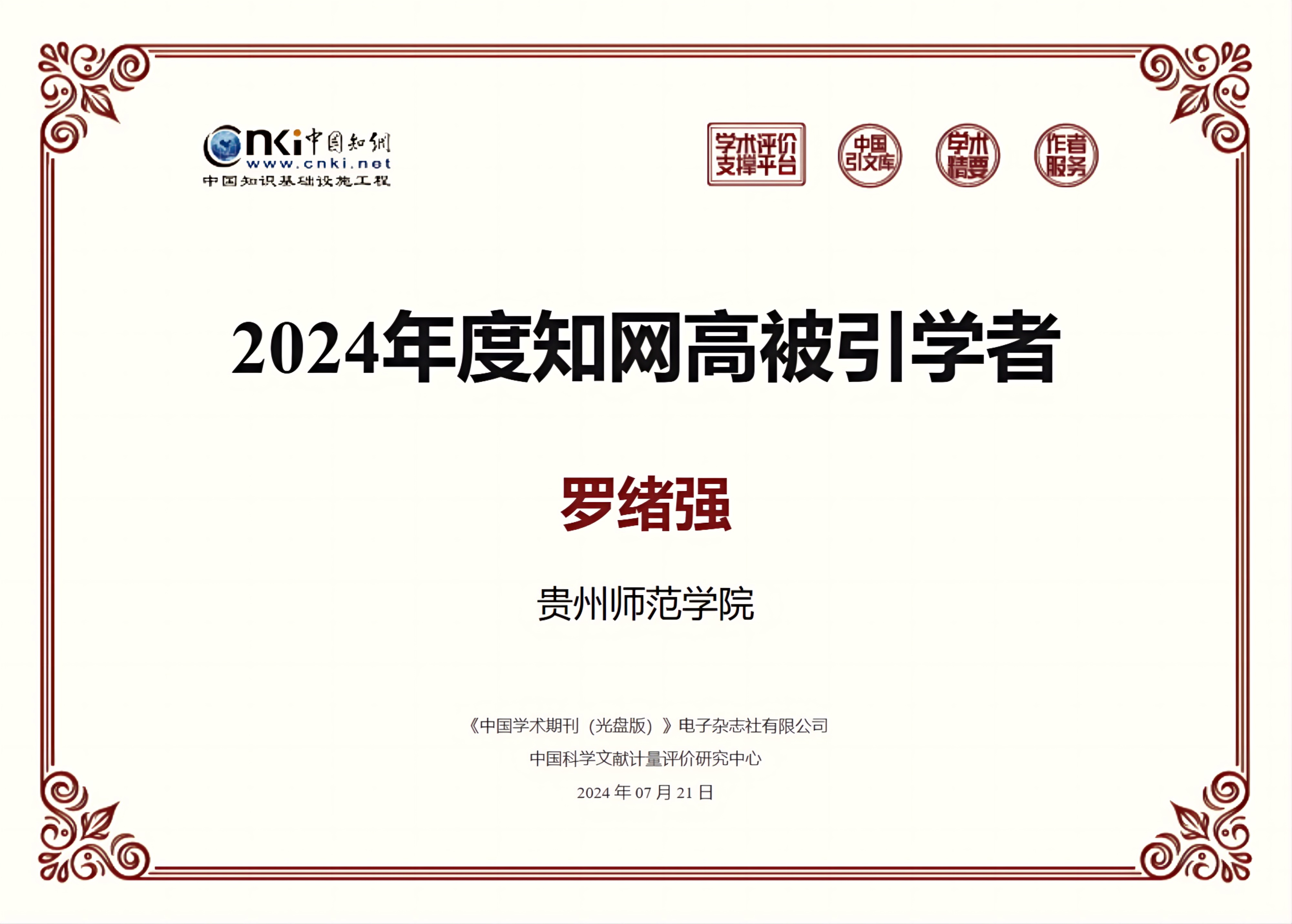 近日,中国知网发布了2024年度高被引学者名单。kaiyun官网三级教授罗绪强成功入选。据悉,此次评选由中国知网“学术精要”数据库依据2013-2023年间学者发表论文的影响力指数进行评选,“高被引学者”遴选范围为近十年发表至少一篇PCSI指数高于1.65期刊或会议论文的学者,且近十年发表期刊会议论文的PCSI指数之和位于上述学者的前1%,并满足以下条件:(1)仅统计PCSI指数大于1.65的论文;(2)至少发表1篇高影响力论文;(3)至少发表5篇PCSI指数大于1.65的论文。