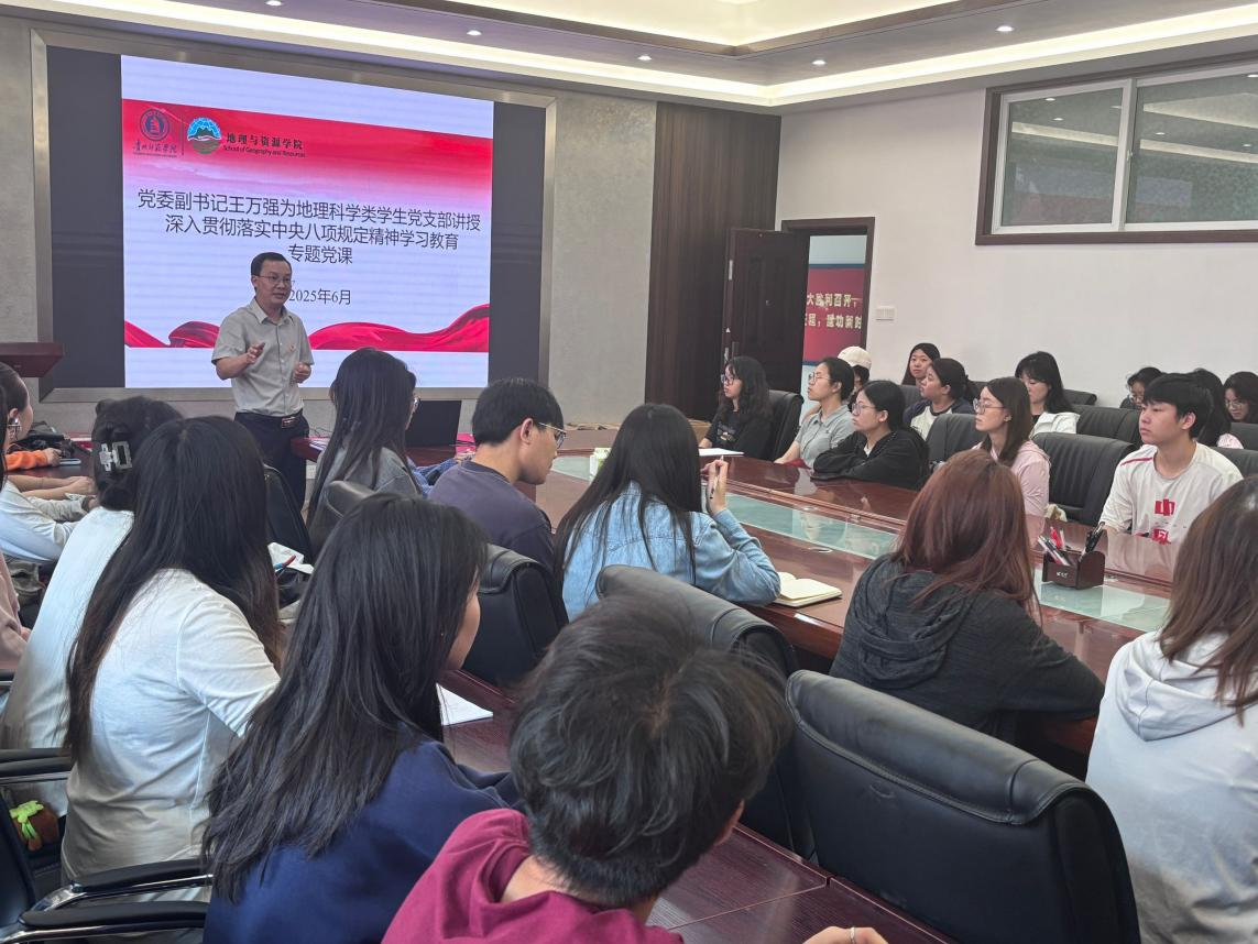 为推动深入贯彻中央八项规定精神学习教育走深走实,6月26日,kaiyun开云官方网站党委副书记王万强在宁静楼323会议室,为地理科学类学生党支部全体党员讲授深入贯彻中央八项规定精神学习教育专题党课,引导支部全体党员深刻领会中央八项规定精神的丰富内涵与实践要求,强化纪律意识,筑牢思想防线。