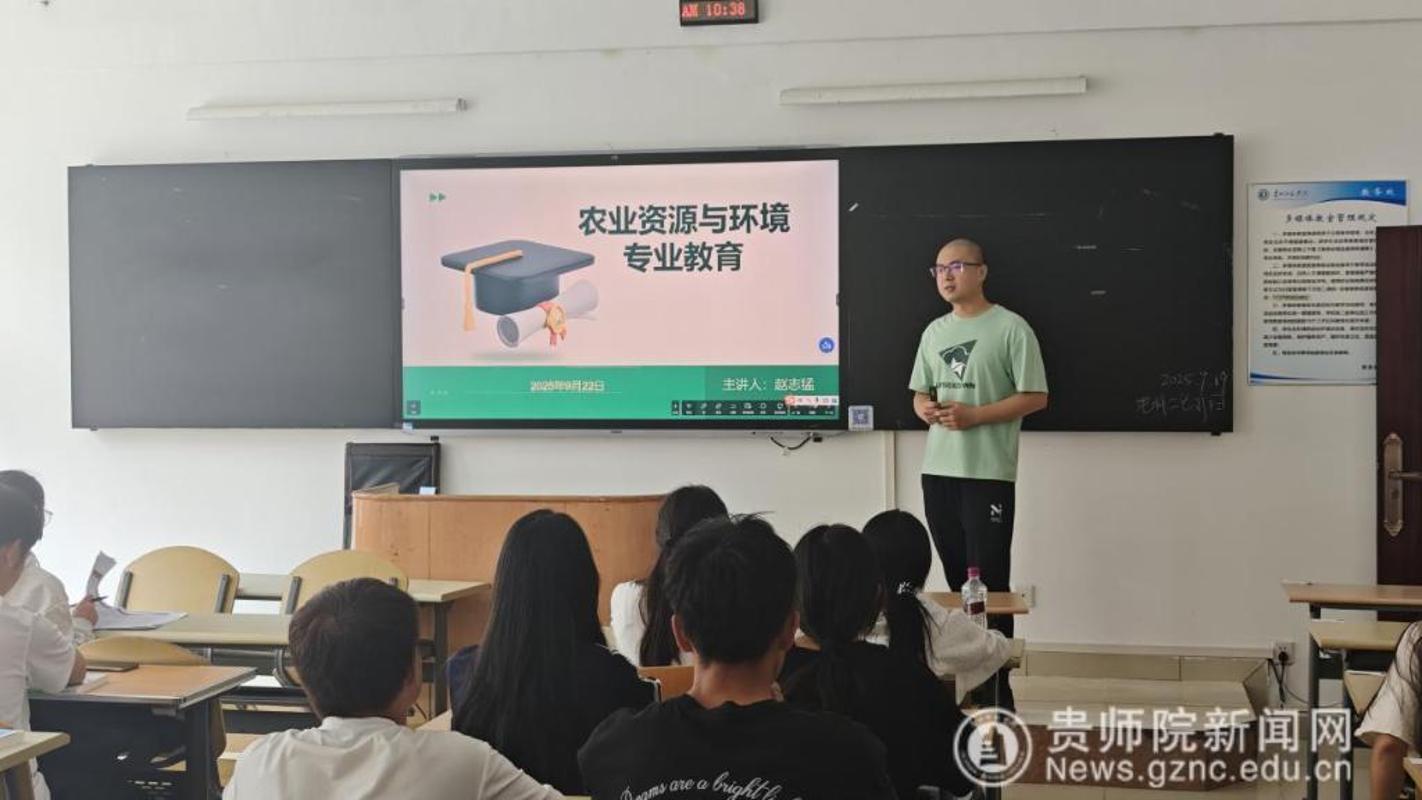 赵志猛以“解码专业密码,锚定成长坐标”为主题,围绕四大核心维度展开讲解。针对新生常见误解,首先澄清专业定位:农资环专业属农学门类,是融合环境科学、生态学、大数据技术的交叉学科,与传统“种地”认知有本质区别。随后,系统展示了专业资源优势,包括资源与环境专业硕士学位点、环境科学省级特色重点学科、环境科学省级教学团队、农业资源与环境省级一流本科专业等学科平台,以及喀斯特典型区实习基地、智慧农业基地等实践育人体系。